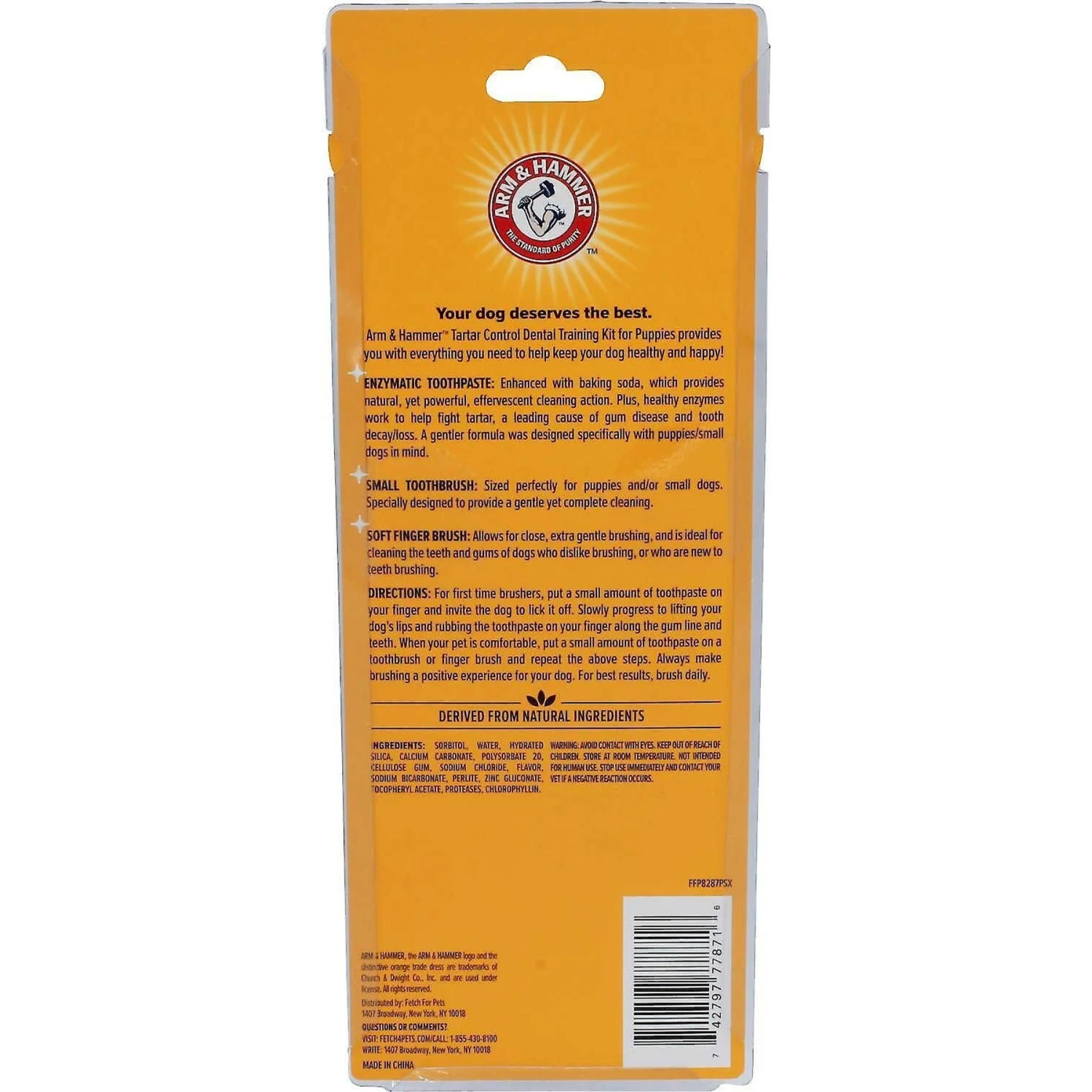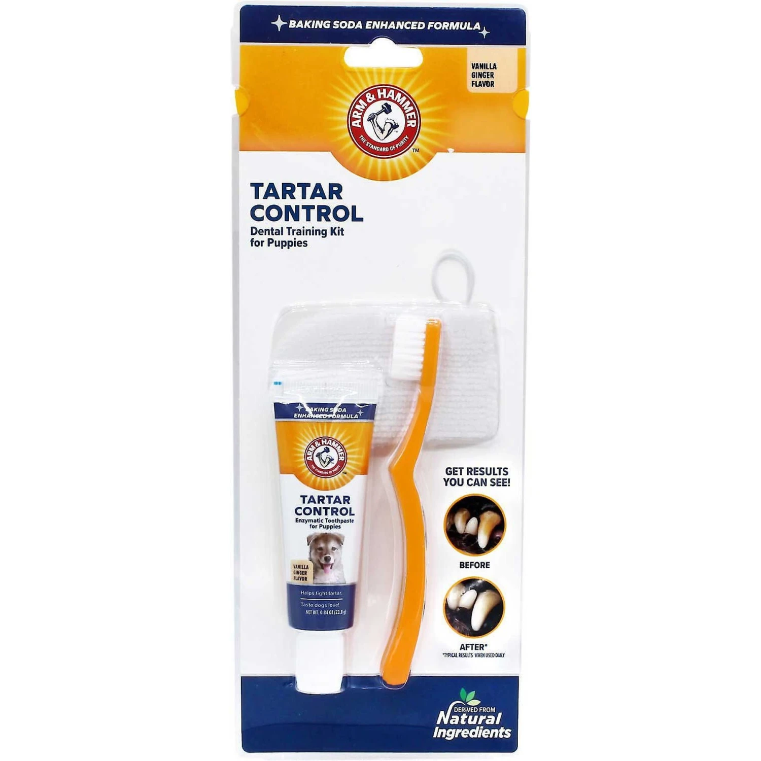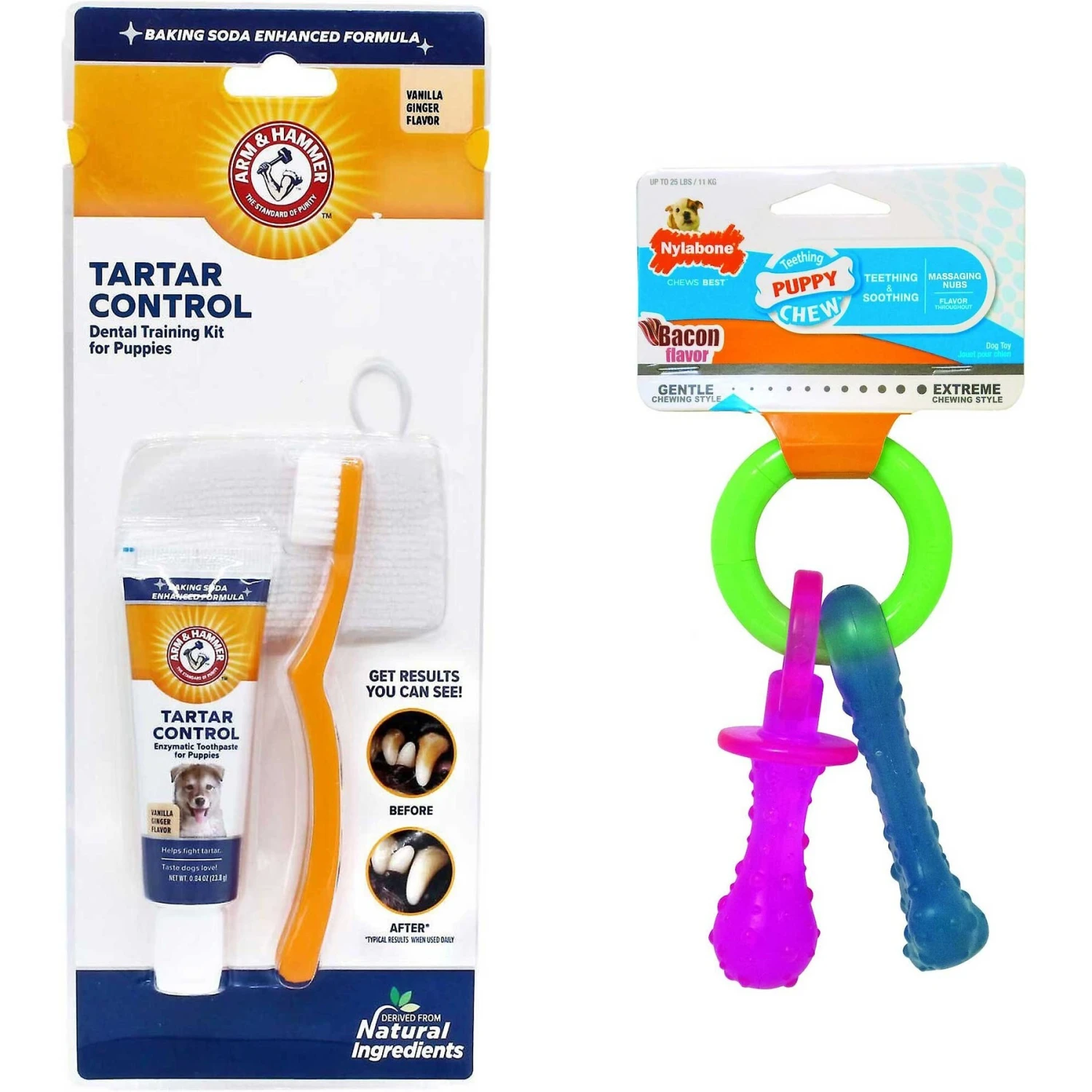 Get your puppy’s teeth ready for a lifetime of smiles with the Arm & Hammer Dental Tartar Control Puppy Enzymatic Toothpaste & Dental Training Kit + Nylabone Teething Pacifier Chew Toy! This kit features a toothbrush, a finger brush and toothpaste, making it easy to ease your little one into a regular teeth cleaning routine and establish a pattern of good oral health. Regular brushing can help ward off bad breath, gum disease, and other mouth infections, and this kit helps do all that and more! Plus, every puppy needs a pacifier to soothe teething pain, look cute, and exercise his chompers for a life filled with treats. This chew toy is designed for teething puppies up to 25 pounds and has raised nubs that stimulate gums and teeth.