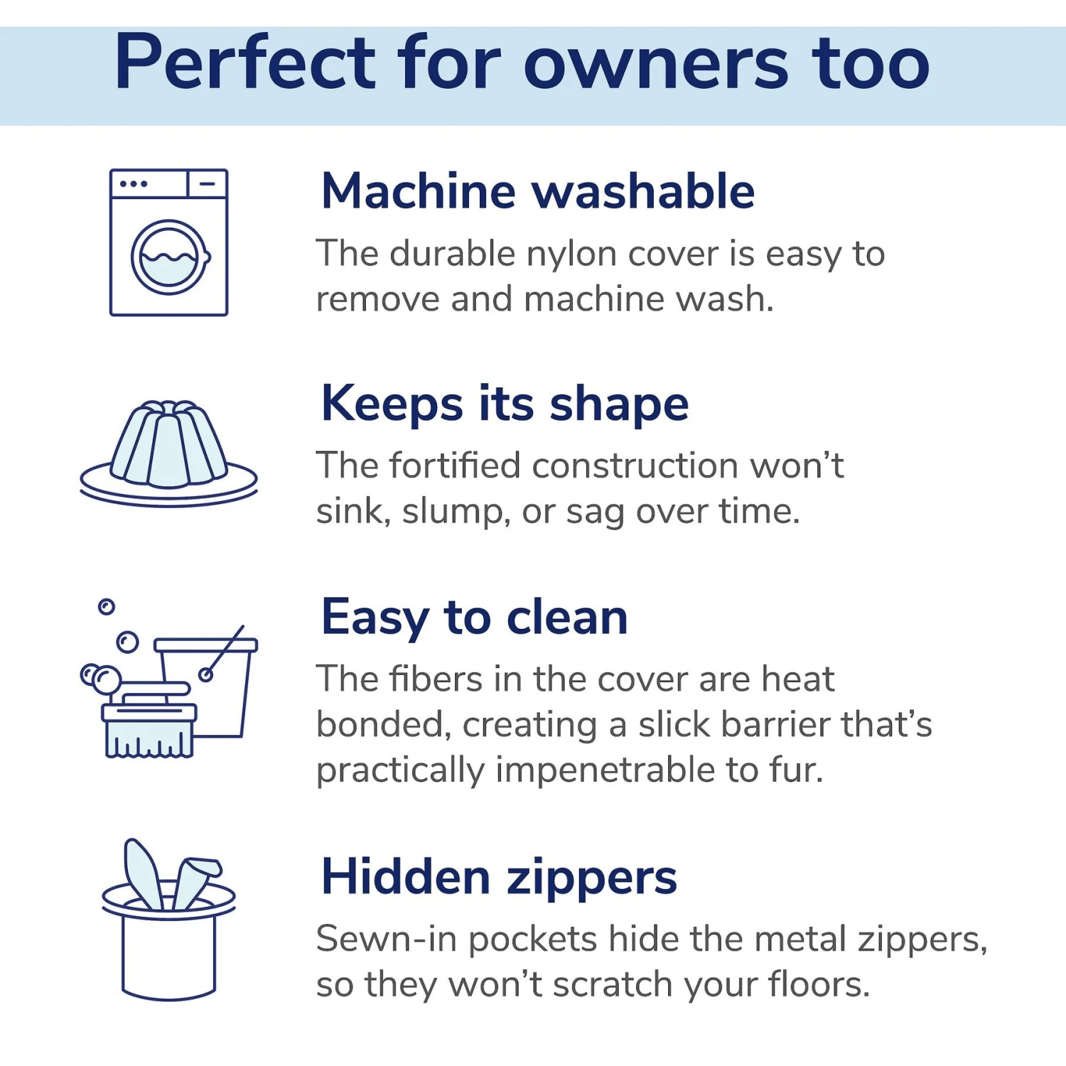 - Crafted with memory foam to help relieve pressure and durable support foam for your pal’s hips and joints. The foam bolsters also offer head and neck support.