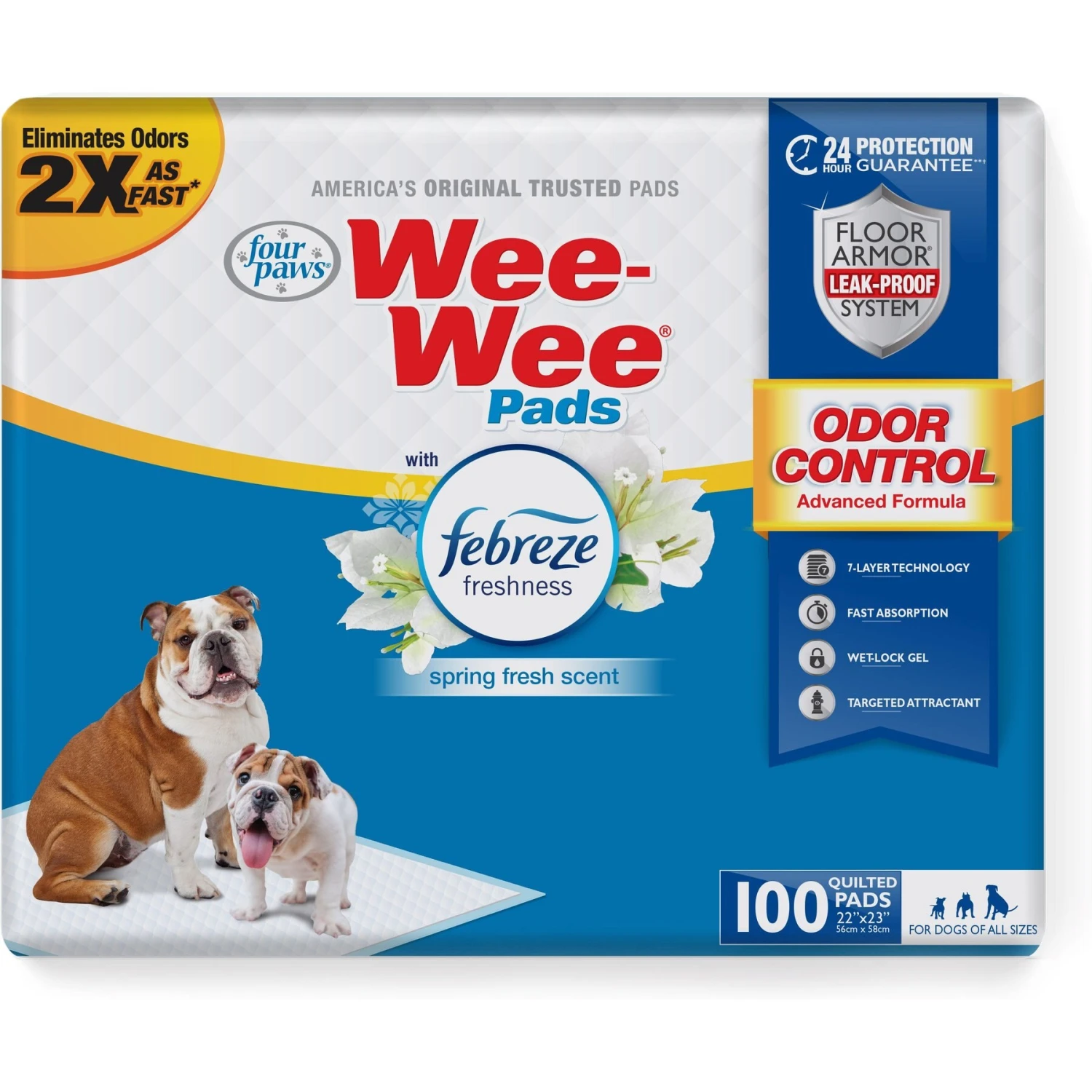 Wee-Wee Odor Control Dog Pee Pads, 22 x 23-in, Scented with Febreze Freshness—Every pet parent and dog deserves a clean and fresh-smelling home. That’s why Four Paws partnered with Febreze to create the ultimate odor-eliminating dog pads. They infused their Wee-Wee Odor Control Dog Pee Pads with Febreze Freshness, which eliminates pet smells and provides a fresh spring scent. These dog training pads eliminate pet odors 2x faster than standard pads. Plus, the 7-layer, leak-proof technology with new oversized quilted pockets provides 24-hour wetness protection. These new Wee-Wee Pads for dogs make house training and cleanup a breeze!