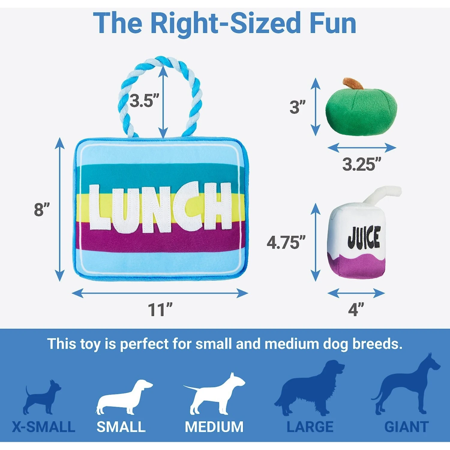 - Stuffed with squeakers inside for the fun your pup wouldn’t trade for any other lunchbox.