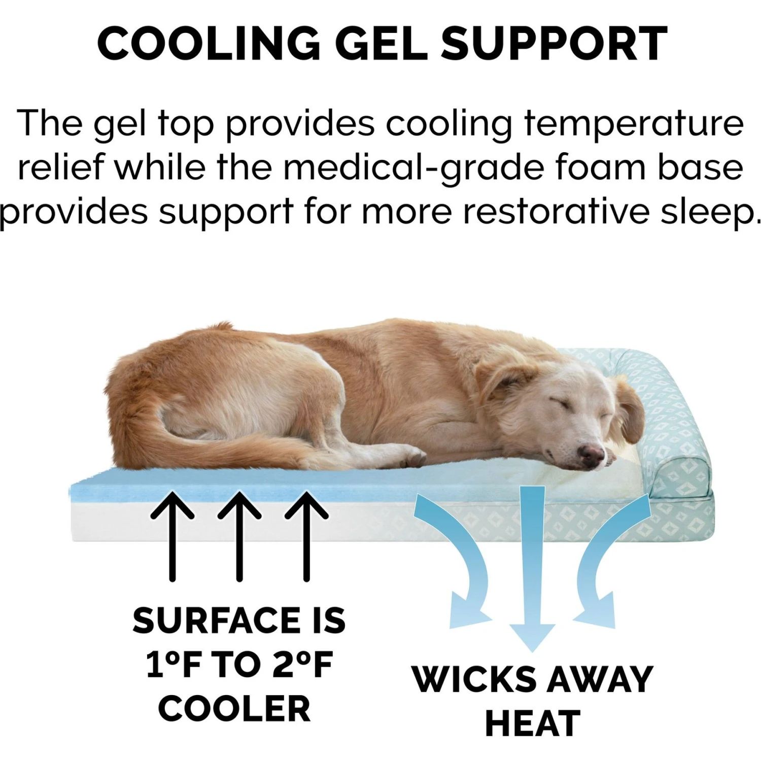 Give your best fur-iend a paw-fect place to rest up after a long day of play with the FurHaven Pet Products Plush Fur & Diamond Print Nest-Top Cooling Gel Sofa Cat & Dog Bed! This stylish, pet bed is modeled after a traditional sofa, and it features a built-in, loose blanket that provides the paw-fect place to dig, nest, and burrow. It features three bolsters and an orthopedic, gel-infused memory foam base to help support joints and pressure points. It also features a removable machine-washable cover, which is a perk for pet paw-rents!