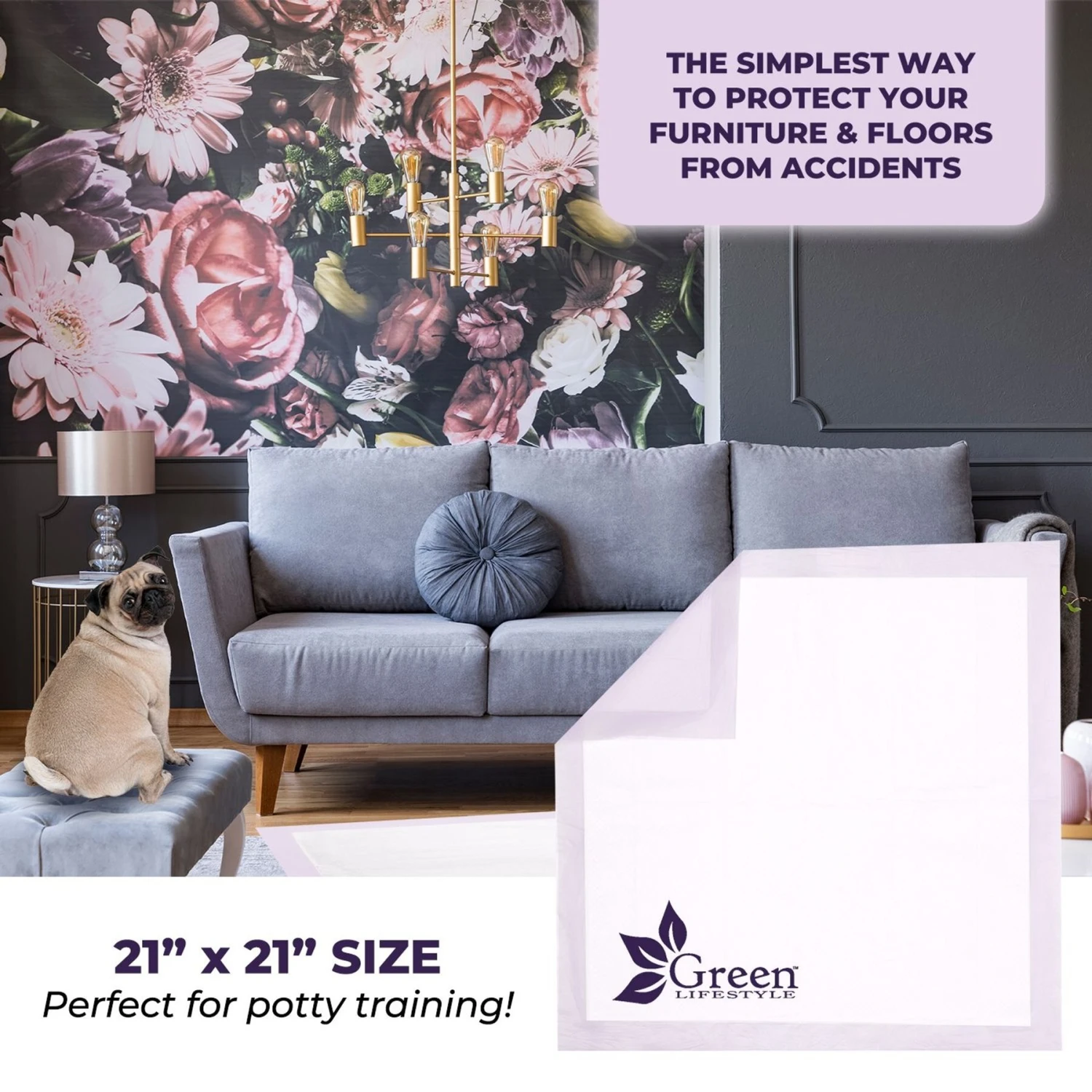 Keep your floor and furniture dry with Green Lifestyle Disposable Lavender Scented Dog & Cat Pee Pads. These highly absorbent, disposable pads are paw-fect for training your puppy and can also handle your older dog’s messes. The ultra-soft top layer keeps your furry friend comfortable and the quilted design absorbs liquid, protecting everything beneath it. Best of all, liquid on the pad activates the release of a soothing lavender scent to help cover the smell of urine.