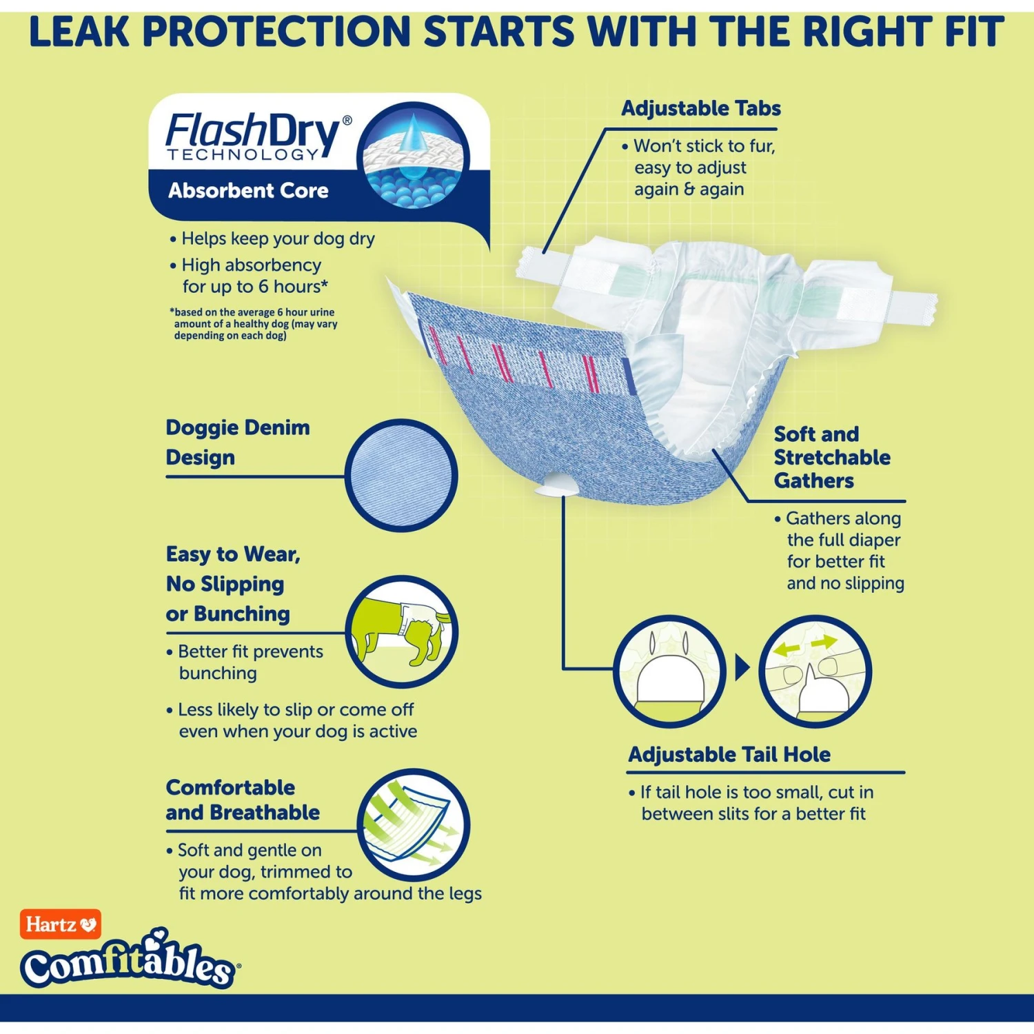 Dealing with your pup’s potty problems can be ruff, so help manage the mess with Hartz’s Disposable Dog Diapers. Paw-fect for traveling with confidence and managing incontinence, female heat cycles, and excitable urination, these diapers feature a FlashDry technology that instantly turns urine into a gel to help keep your dog dry for up to six hours! These diapers also follow the natural contour of your sidekick’s waist and leg structure, delivering a comfortable and breathable feel, with soft and stretchable gather that’s also snug and secure for plenty of protection. And with an adjustable tail hole and adjustable fuzzy fastener tabs, you can customize the fit for dogs of all shapes and sizes!