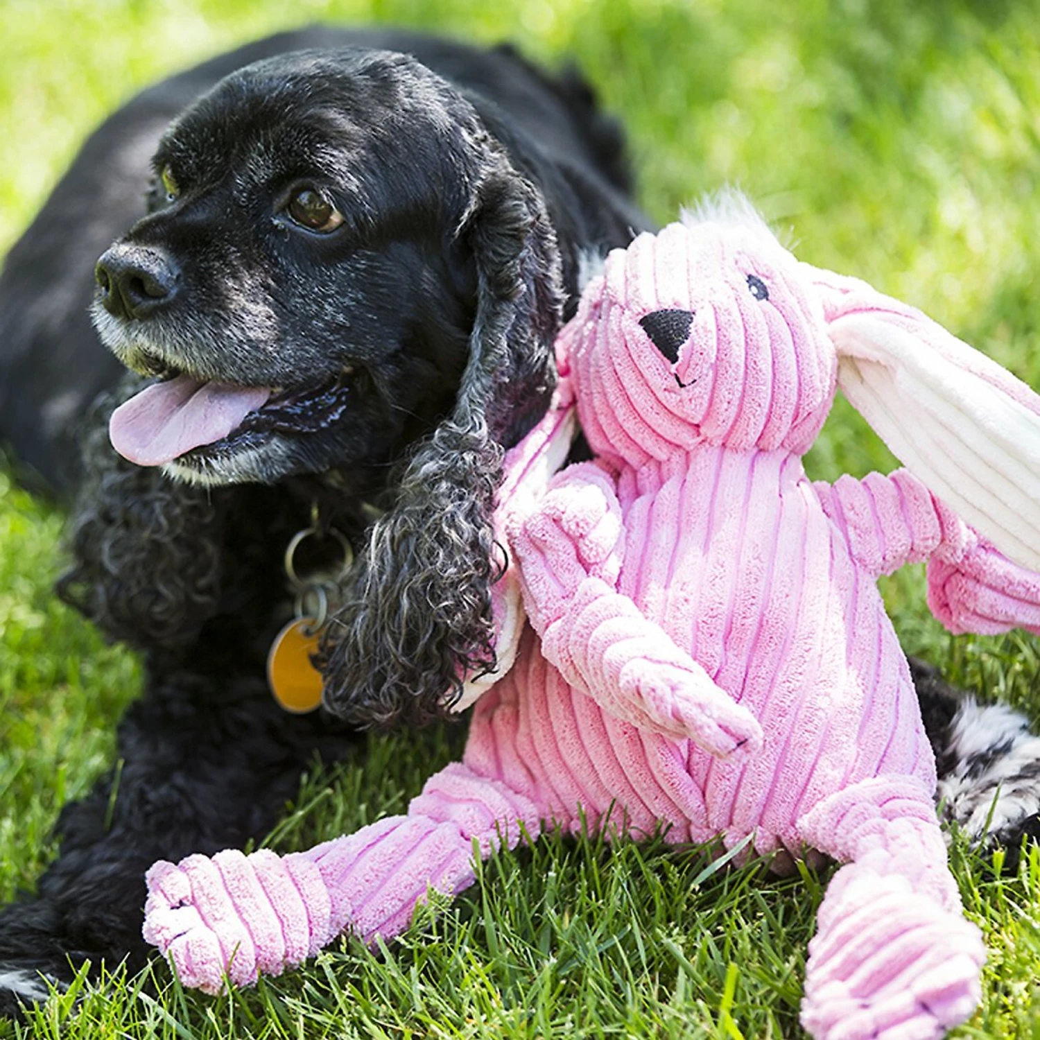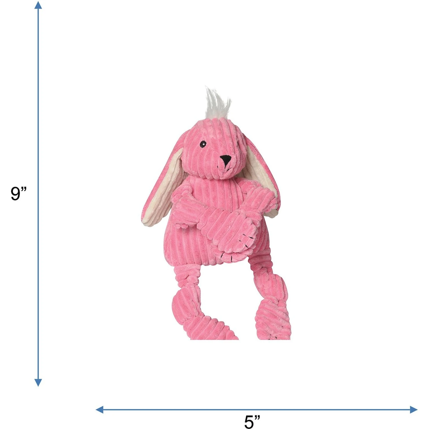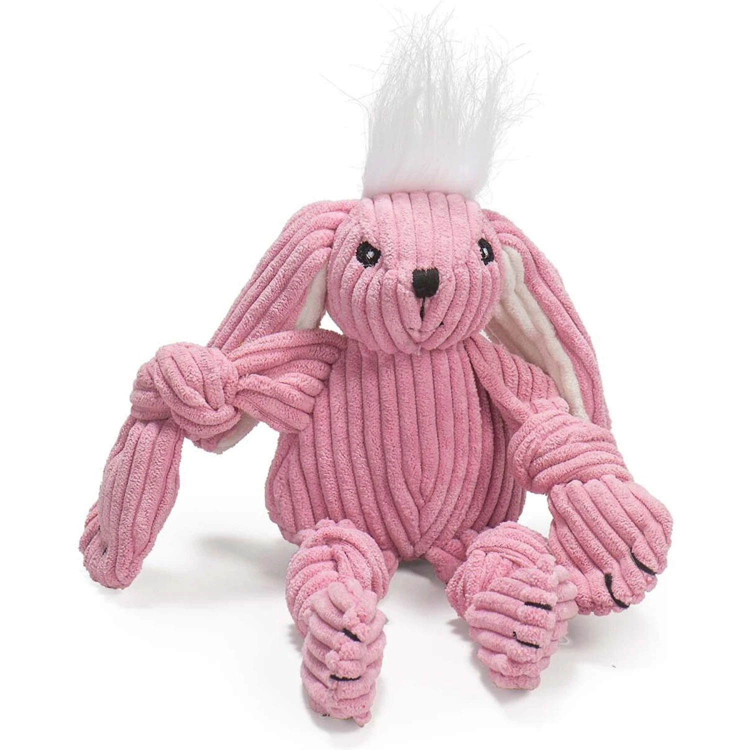 The HuggleHounds Barnyard Durable Plush Corduroy Knottie Bunny Squeaky Dog Toy is made with a double-layer liner, which helps to defend against tugs and tosses. And, speaking of tugging, this barnyard buddy is specially designed for it, with knots in each limb and five squeakers to engage and entertain your dog as he plays—whether your pup tugs along with you or goes solo. With multiple ways to play, this machine-washable toy is ideal for dogs of all ages, sizes and breeds.
