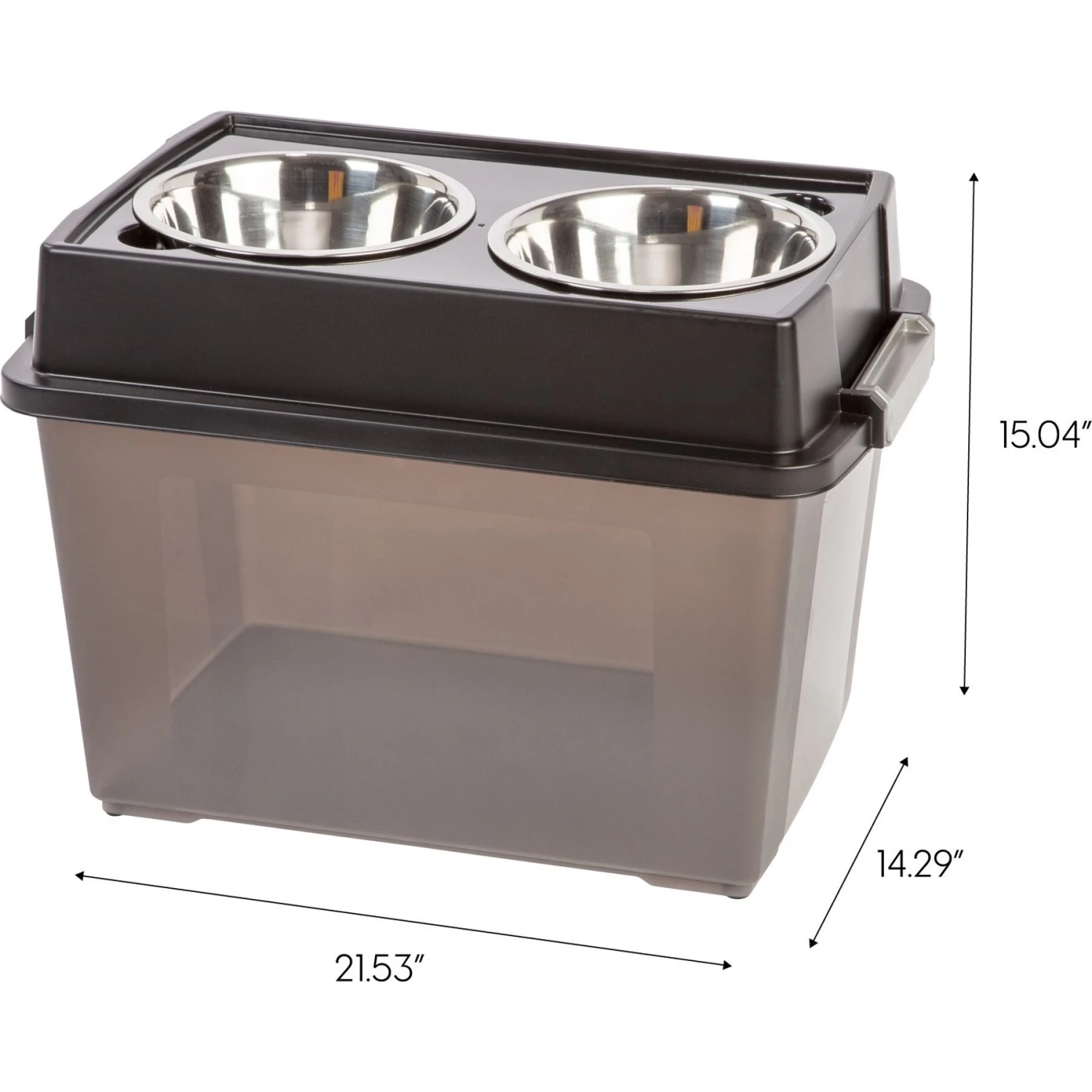 - Provides convenient storage and feeding all in one, includes two removable, stainless-steel bowls for easy cleaning and each bowl holds two quarts of water or food.