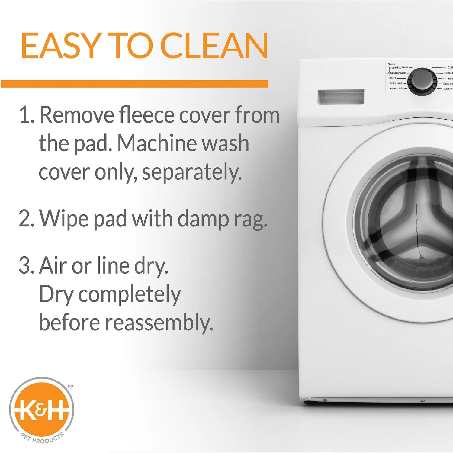 - To clean, wash the faux fleece cover on the gentle cycle with cold water, then line dry. The heated pad can be cleaned using a damp towel or sponge and mild dish washing detergent. Do not wash in a washing machine.