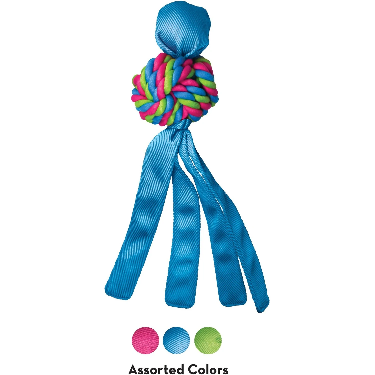 - Made with durable, ballistic nylon for added toughness, a squeaky ball on one end and tails on the other for extra shaking fun