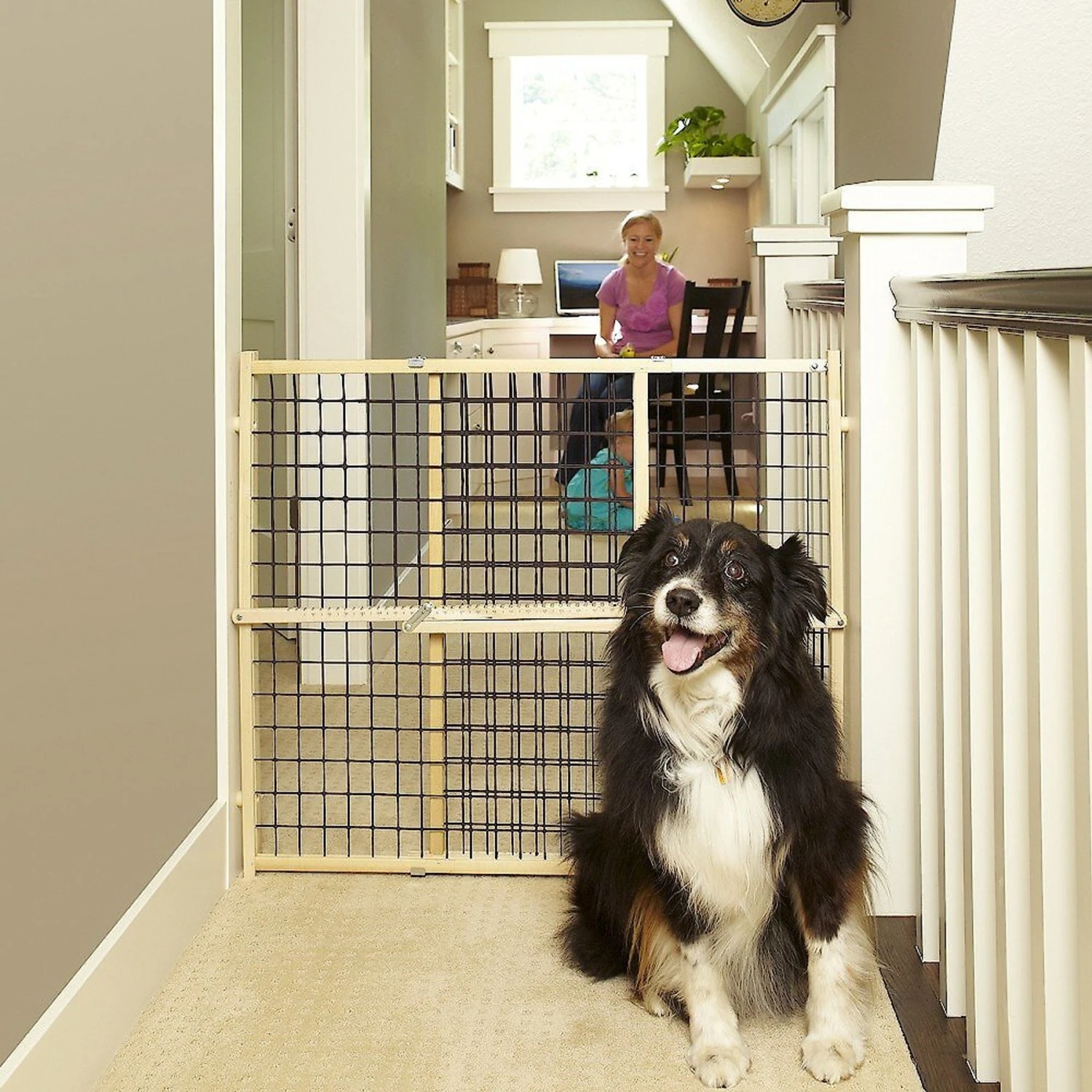 Give your pet his very own paw-sonal space with MyPet’s Extra Wide Wire Mesh Gate! Designed for those extra-wide openings in your home, this wooden gate is ideal to keep your pet safely contained. The gate is 31 inches tall and uses pressure mounts to easily and securely keep it in place—that means no hardware or drilling required! The rigid vinyl-coated brown wire mesh panels easily adjust to fit openings in your home that are between 29.5 to 50 inches wide. And best of all, the frame of the gate is purposely designed with a neutral color to help keep your walls clean and free of marks.