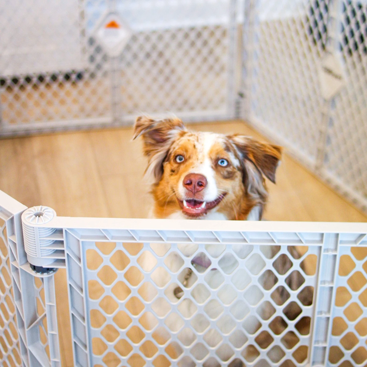 - Features six interlocking, expandable panels that allow you to easily change the size and shape with encloses up to 18.5 square feet and is 26 inches high.