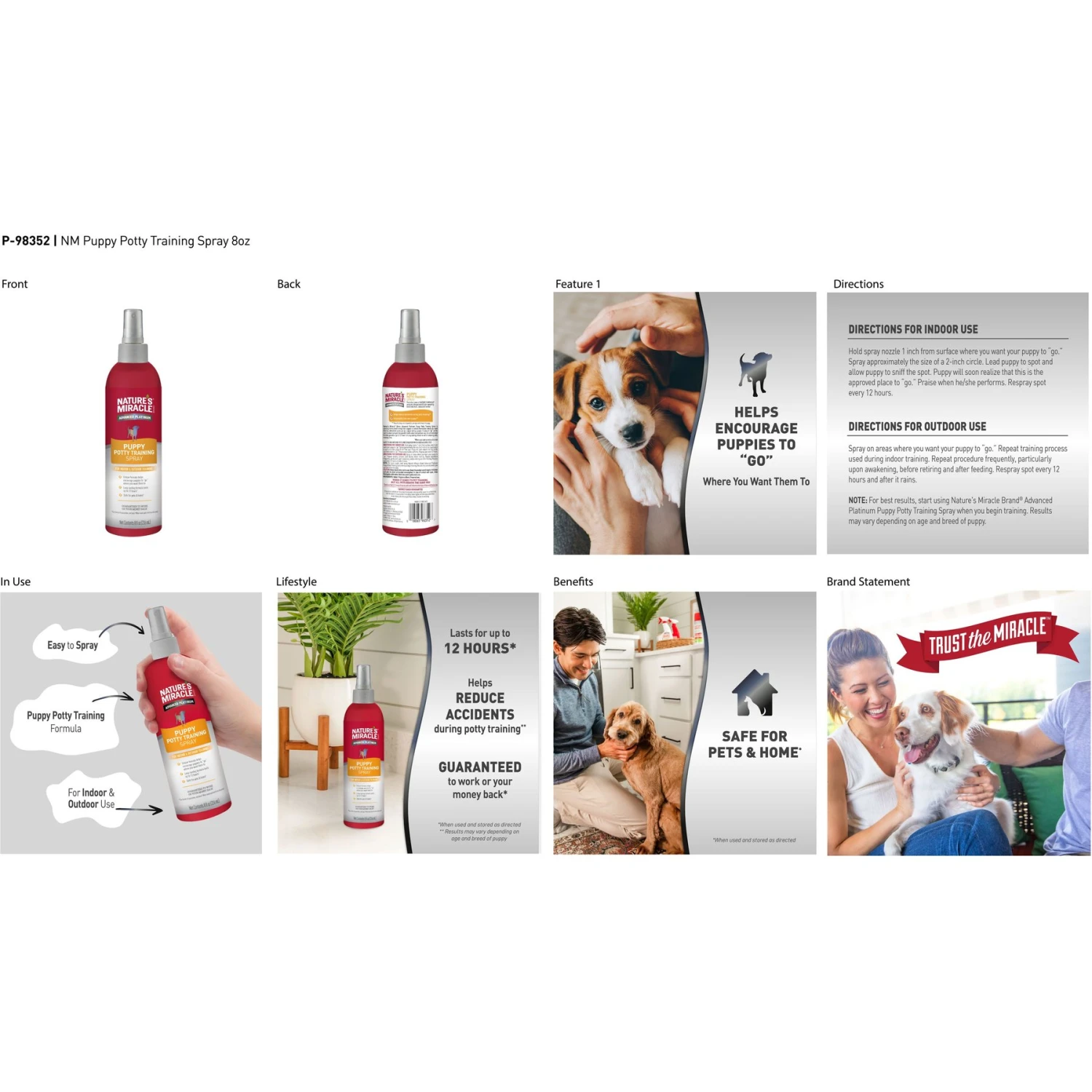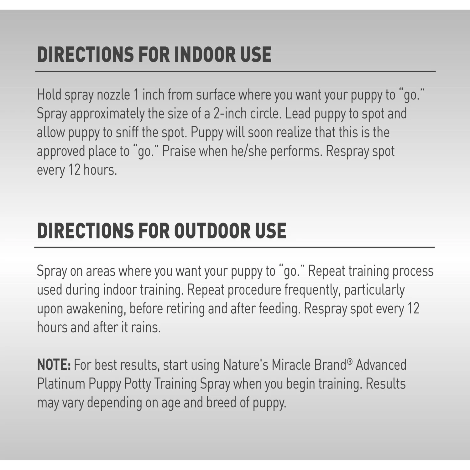 Directions for Outdoor Use: Spray on areas where you desire your dog to eliminate. Repeat process frequently while animal is being trained. Repeat procedure frequently—particularly upon awakening, before bedtime, and after feeding your dog.