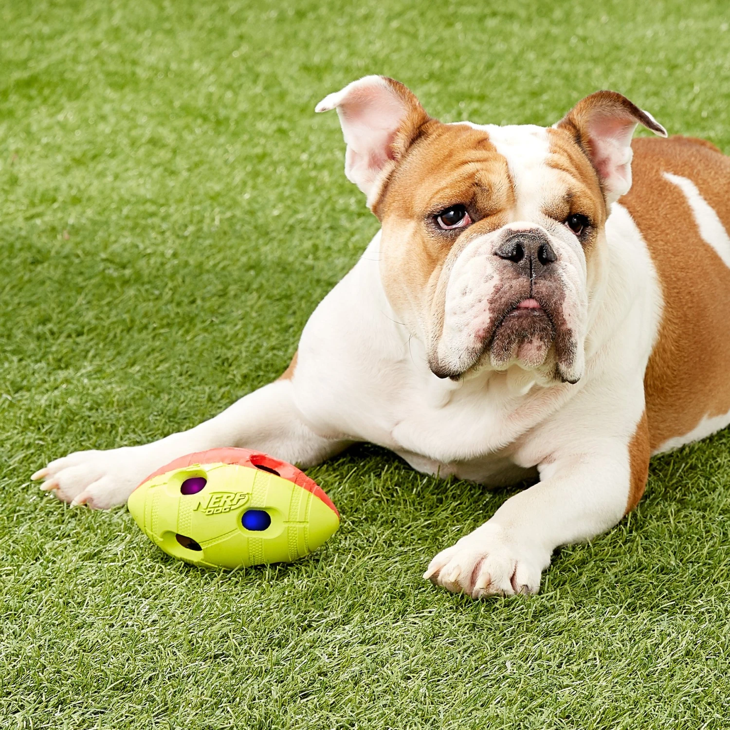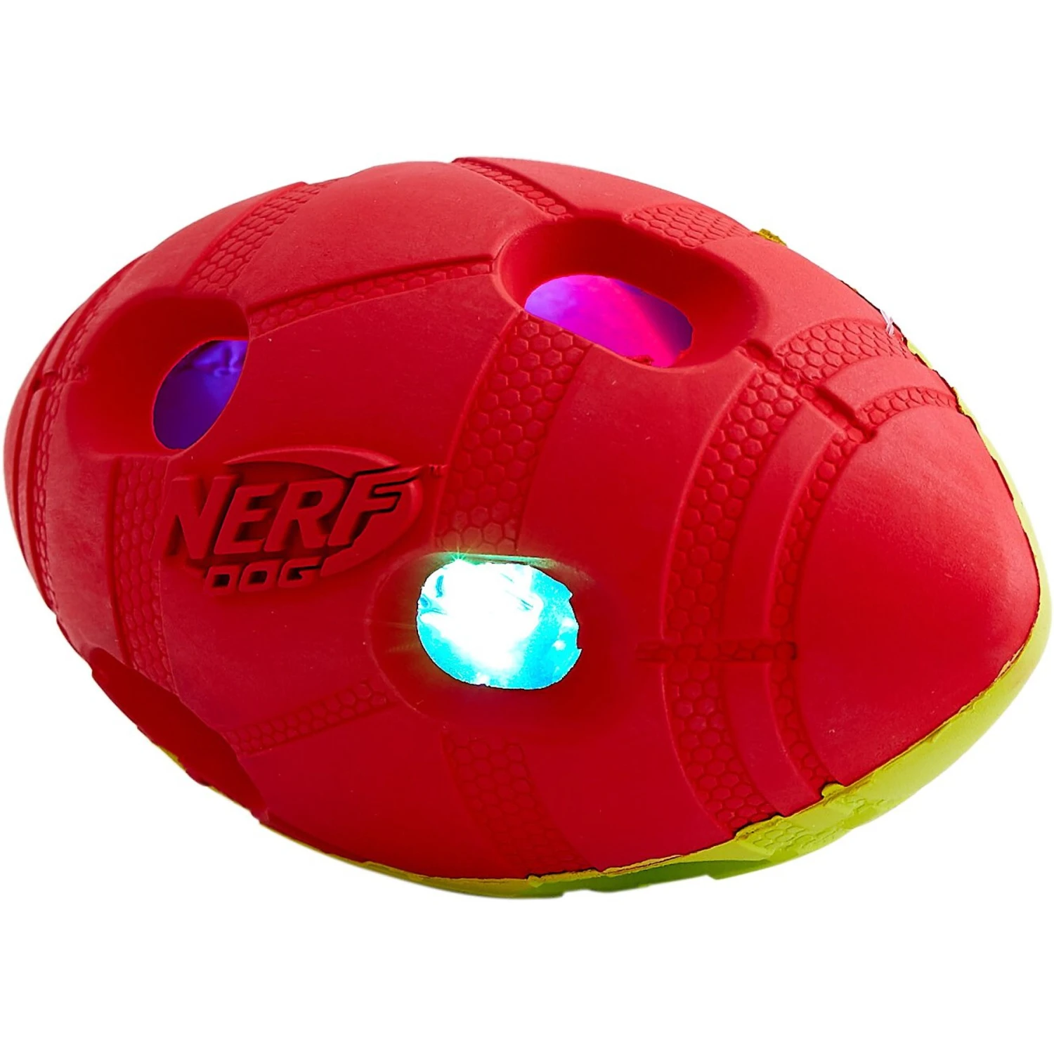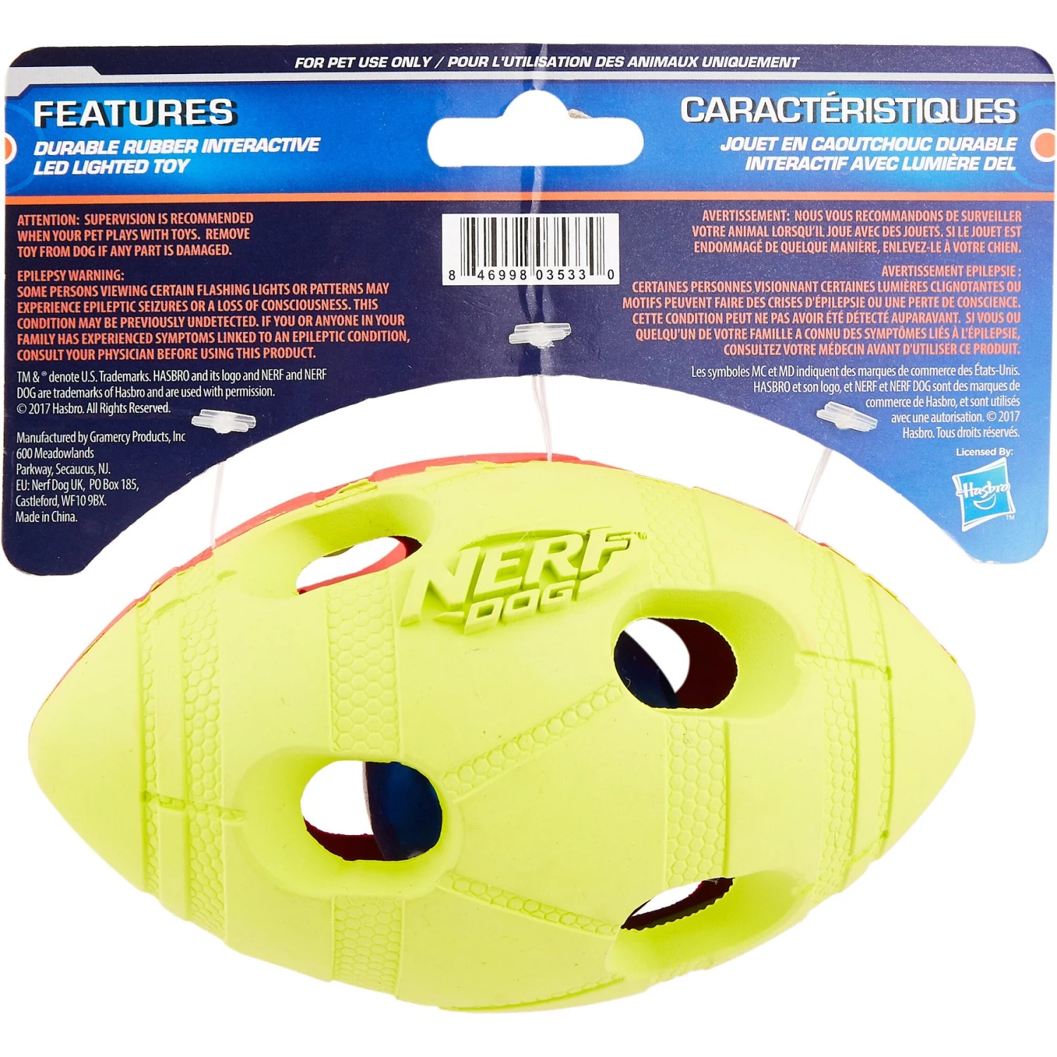 Go long with your energetic pal with the Nerf Dog Light Up Bash Football Dog Toy. This unique, football-shaped bounce fetch toy will provide hours of action-packed fun thanks to a flashing LED light inside that makes running after it that much more exciting—from sun up to sun down. Built with durable materials like thermoplastic rubber to withstand extra tough play, and lightweight enough for on demand games of fetch, it’s ideal for active pups and to provide much-needed exercise for dogs that need more encouragement. Plus, thanks to its high-buoyancy design, it’s ideal for water loving pups at the beach, lake, pool, or your favorite spot!