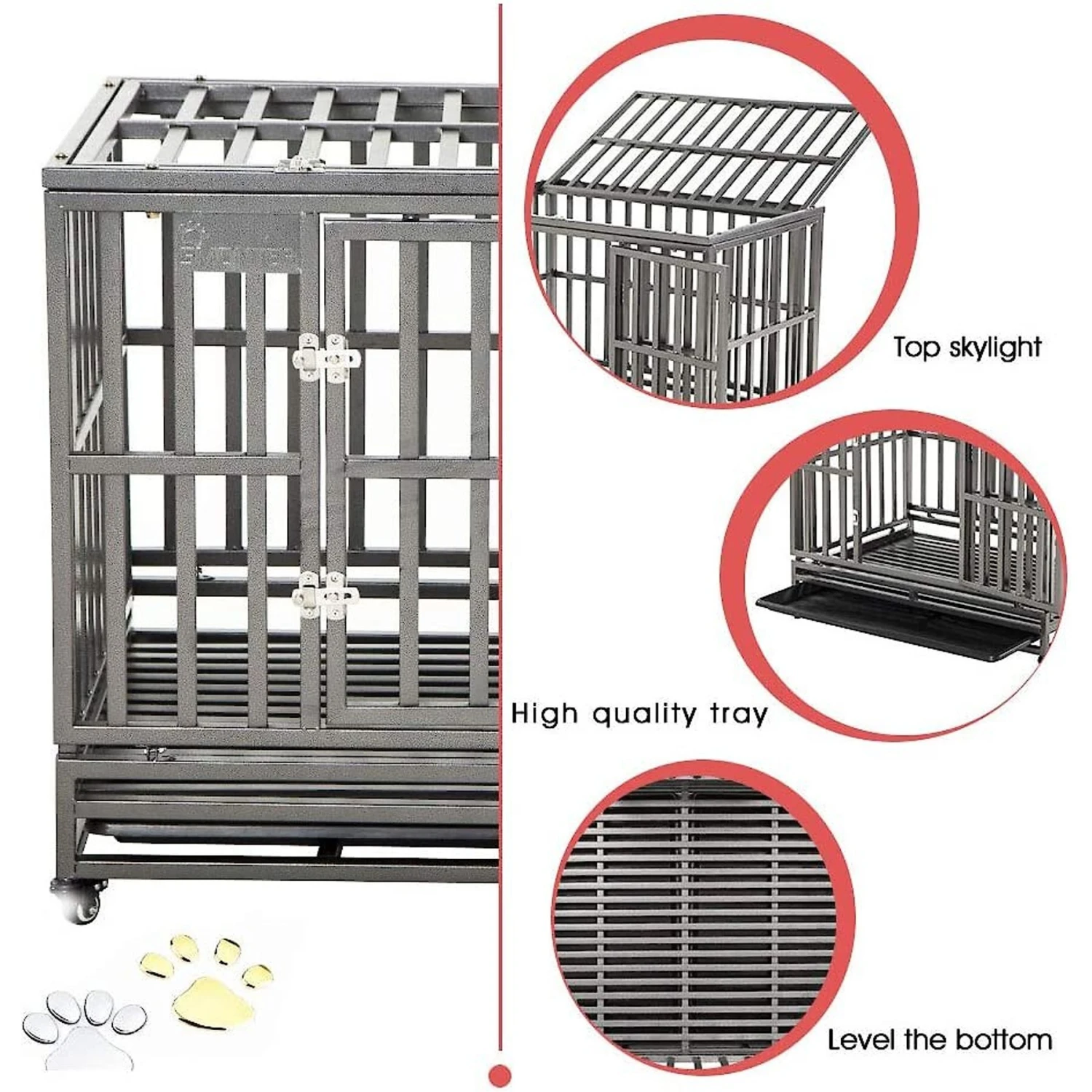The SMONTER Heavy Duty Strong Metal I Shape Dog Crate is a durable kennel constructed with a reinforced steel frame that’s treated with a non-toxic, multi-layer hammer-tone coating. This coating allows it to stand up to rust, corrosion, scuffs and scratches. Paw-fect for indoor and outdoor use, this crate is welded and features a double lock with safety latches to ensure even some of the most rambunctious canines stay contained. Plus, your pup will get plenty of ventilation and visibility while inside, providing him with a comfortable environment. The removable plastic tray slides out, so you can easily wipe it down for hassle-free cleaning and the 360-degree rotating wheels and locking casters allow for easy portability or stability when needed. This crate is shipped partially assembled—all you have to do is screw the parts together!