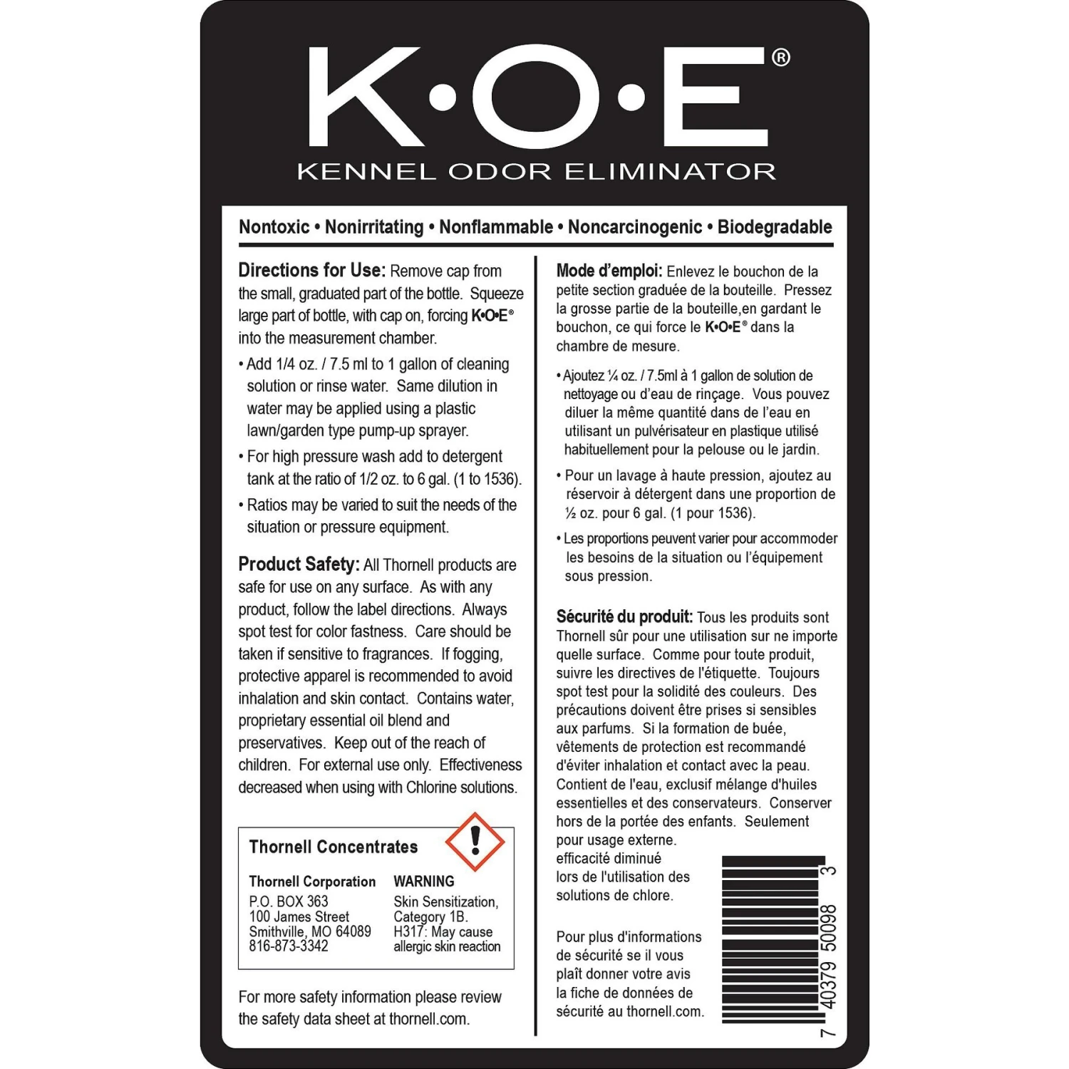 Banish stinky smells with Thornell’s K.O.E. Kennel Odor Eliminator Concentrate! This veterinarian favorite is specifically designed to remove offensive odors from cages, runs, kennels and other large pet areas. Its mild formula is gentle enough to be used near your pets, yet powerful enough to eradicate even the most offensive odors known to man. Plus, K.O.E is uniquely formulated to work without the use enzymes, which don’t always get the job done. From catteries to kennels—this highly effective deodorizer removes foul odors instead of simply covering up the smell.