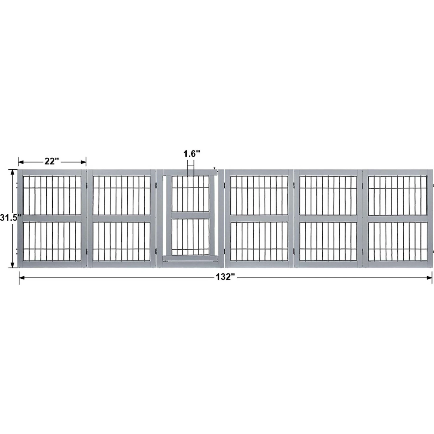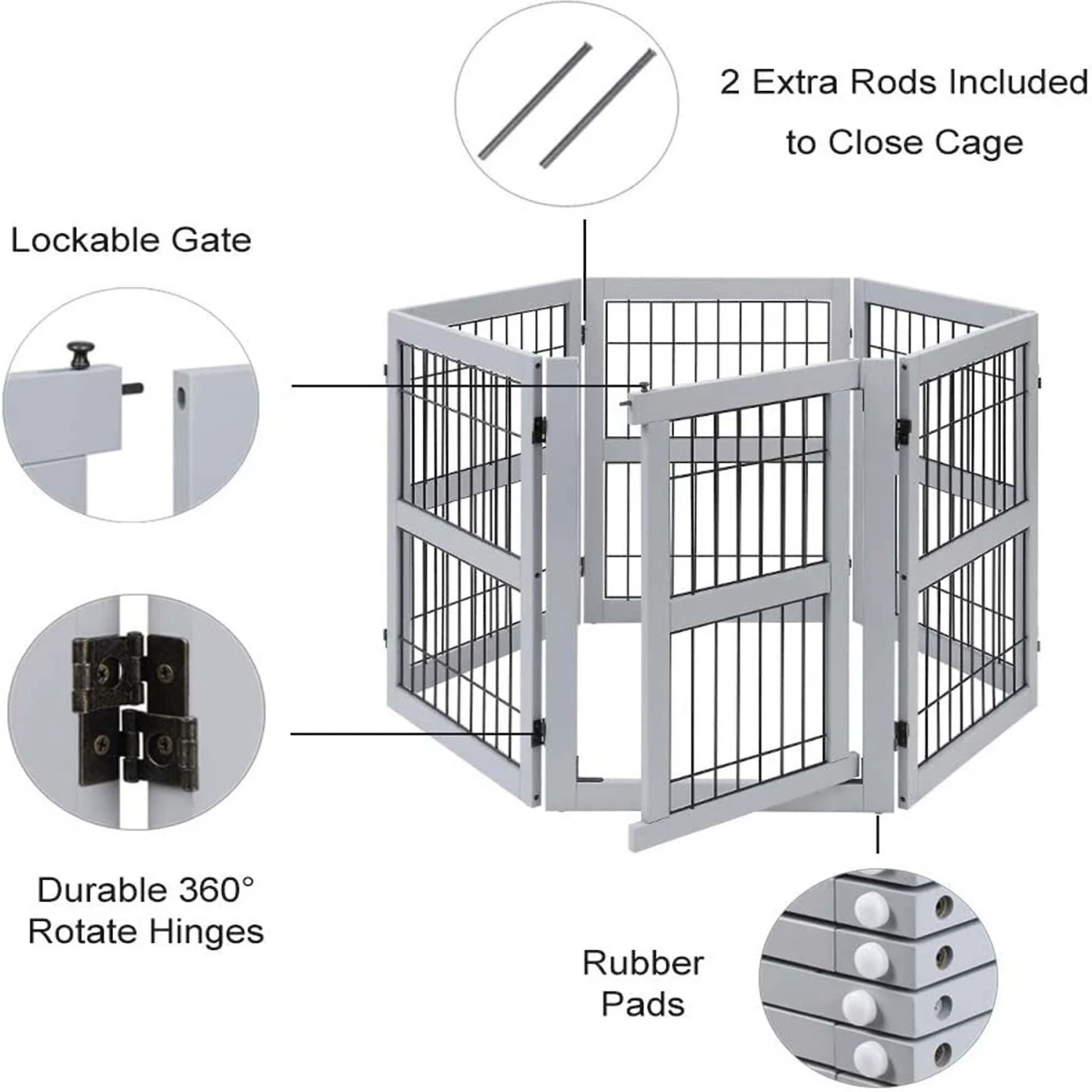 The Unipaws 6 Panel Wooden Wire Dog Gate is versatile and perfect for furbaby playtime. The six panels feature four extra support feet for paw-some stability. Sturdy hinges mean you can unfold the panels into a U-shape to keep your furbabies out of trouble in your home. Or, choose to set the playpen up in a hexagon or rectangle shape for plenty of play space. The gate’s durable wooden frame and steel wire interior are chew-resistant for long-lasting use and safety. To save time, the built-in swinging door allows both the two-legged and four-legged members of your home to pass through the gate easily without moving the entire gate panel.