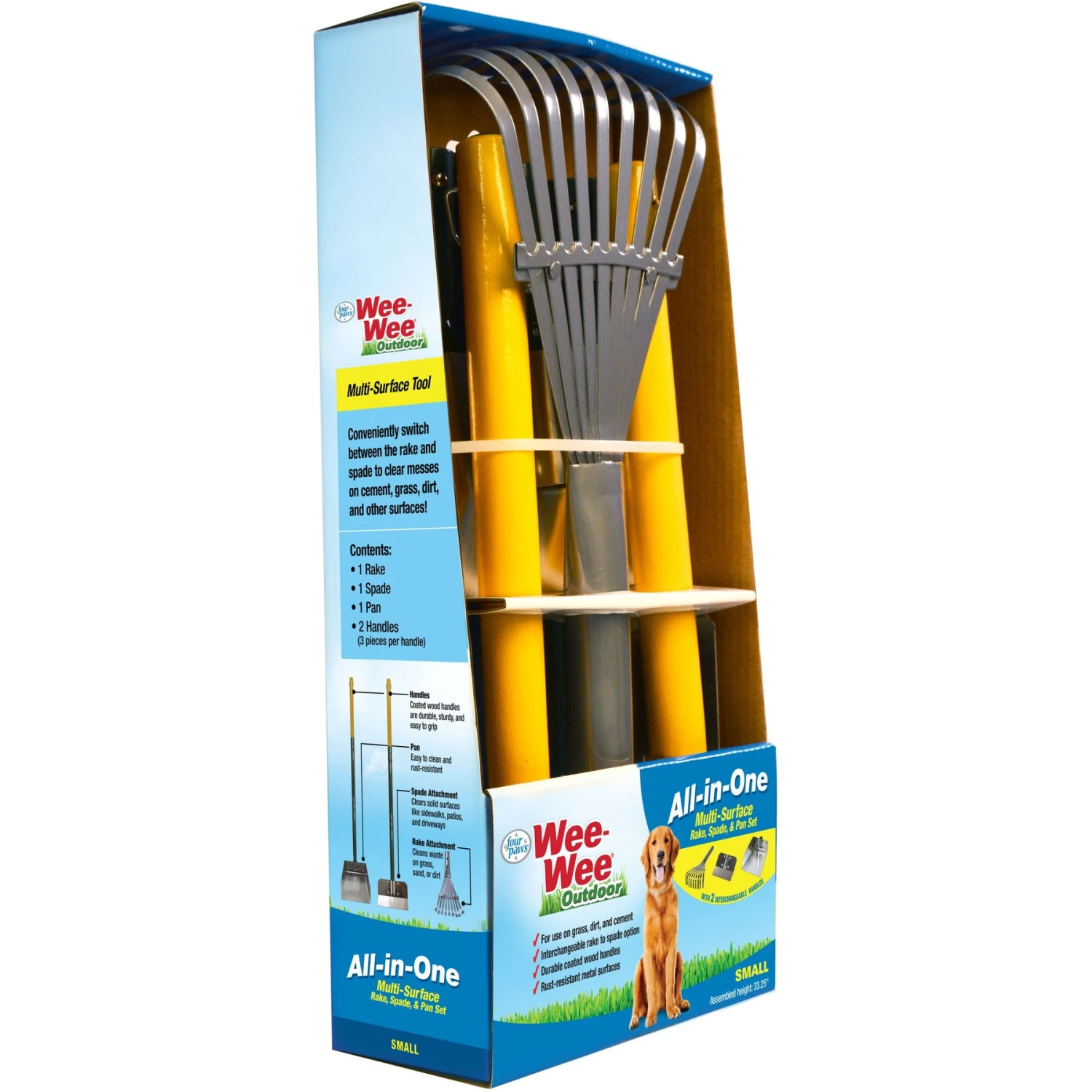 The Four Paws Wee-Wee All-in-One Dog Poop Rake, Spade and Pan Set is a versatile dog poop clean up solution! The interchangeable attachments allow paw-rents to clear messes on many types of surfaces. The rake attachment is ideal for cleaning up waste on grass, sand or dirt, while the spade is perfect for clearing flat surfaces such as sidewalks, patios and driveways. The non-stick, weatherproof metal surfaces won’t rust, while the comfortable handles are made of coated wood that resist splintering or cracking. Plus, they’re conveniently sized so you won’t have to bend over. When it comes time to store away the set, each handle includes a hook for hanging. For compact storage, this set also features push-pins for quick assembly and disassembly.