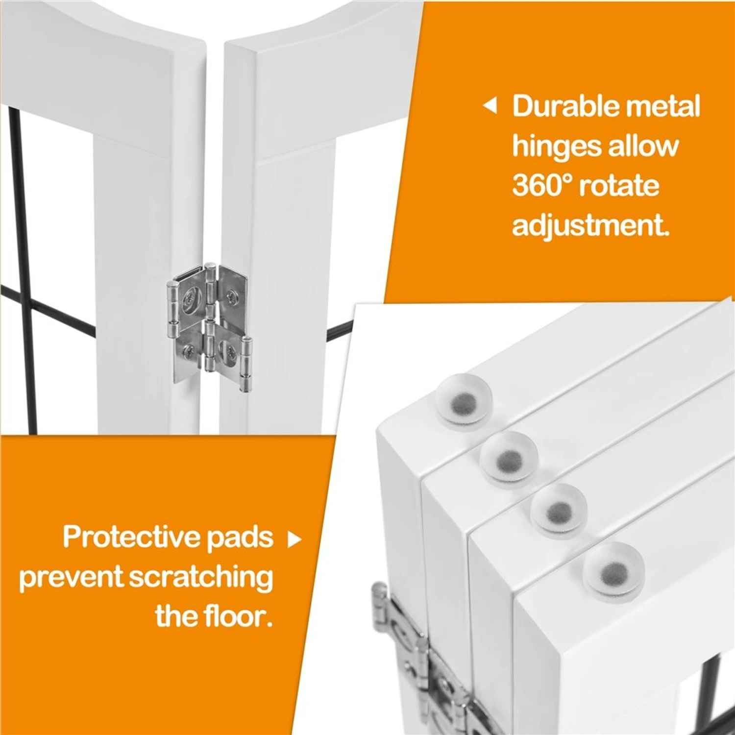 Keep your pup safe and secure with the Yaheetech 4-Panel Dog Gate. Constructed from durable MDF and metal, this pet gate is designed to last. With an arched top and spray-painted MDF, it fits nicely with your decor. The gate has four separate panels that are secured with sturdy hinges, allowing it to fold out into a Z-shape or square configuration. Protective footpads and EVA foam protect your floor from scratches and account for slightly uneven surfaces. Suitable for doorways, entryways, halls, bedrooms, and staircases.