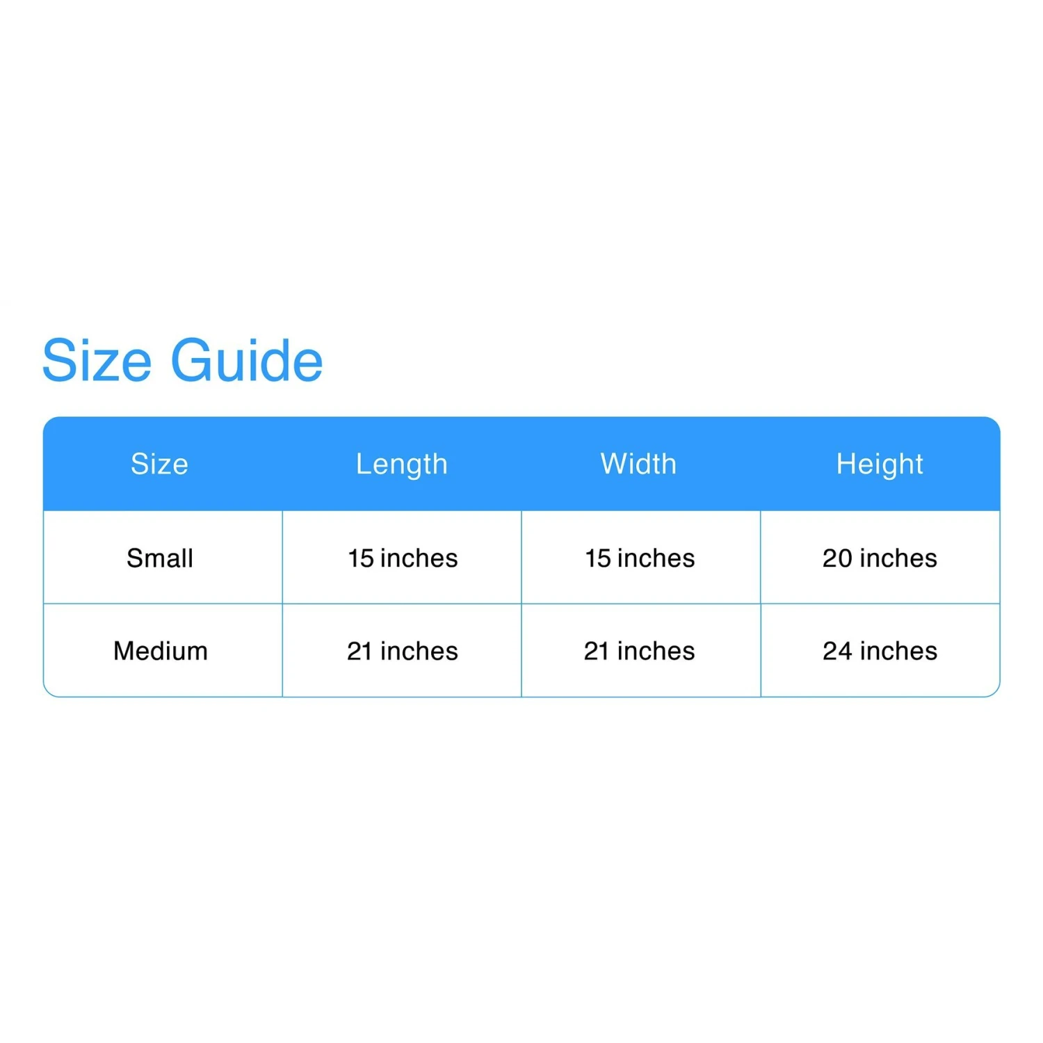 - Available in two sizes–small measures 15 x 15 x 20 inches and medium measures 21 x 21 x 24 inches.