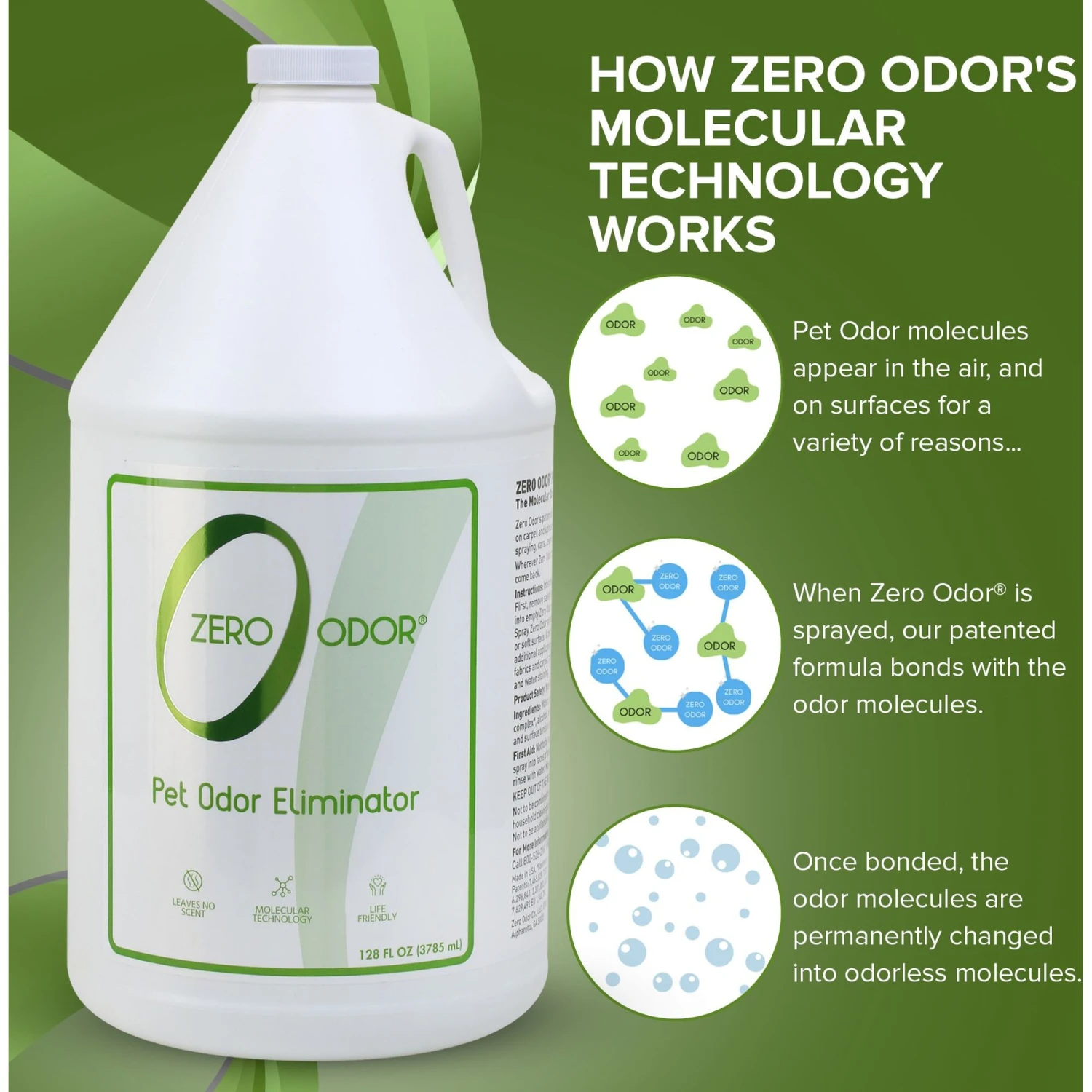 Spray Zero Odor® anywhere – in the air or on any hard or soft surface. If pet odor is deeply embedded, additional applications may be necessary. on fabrics and carpet, pre-test for colorfastness and water staining.